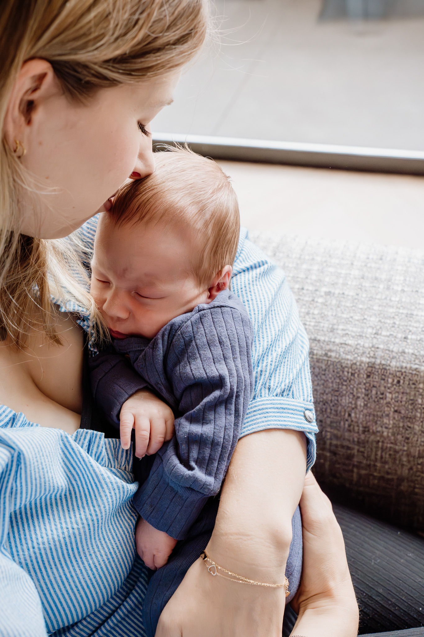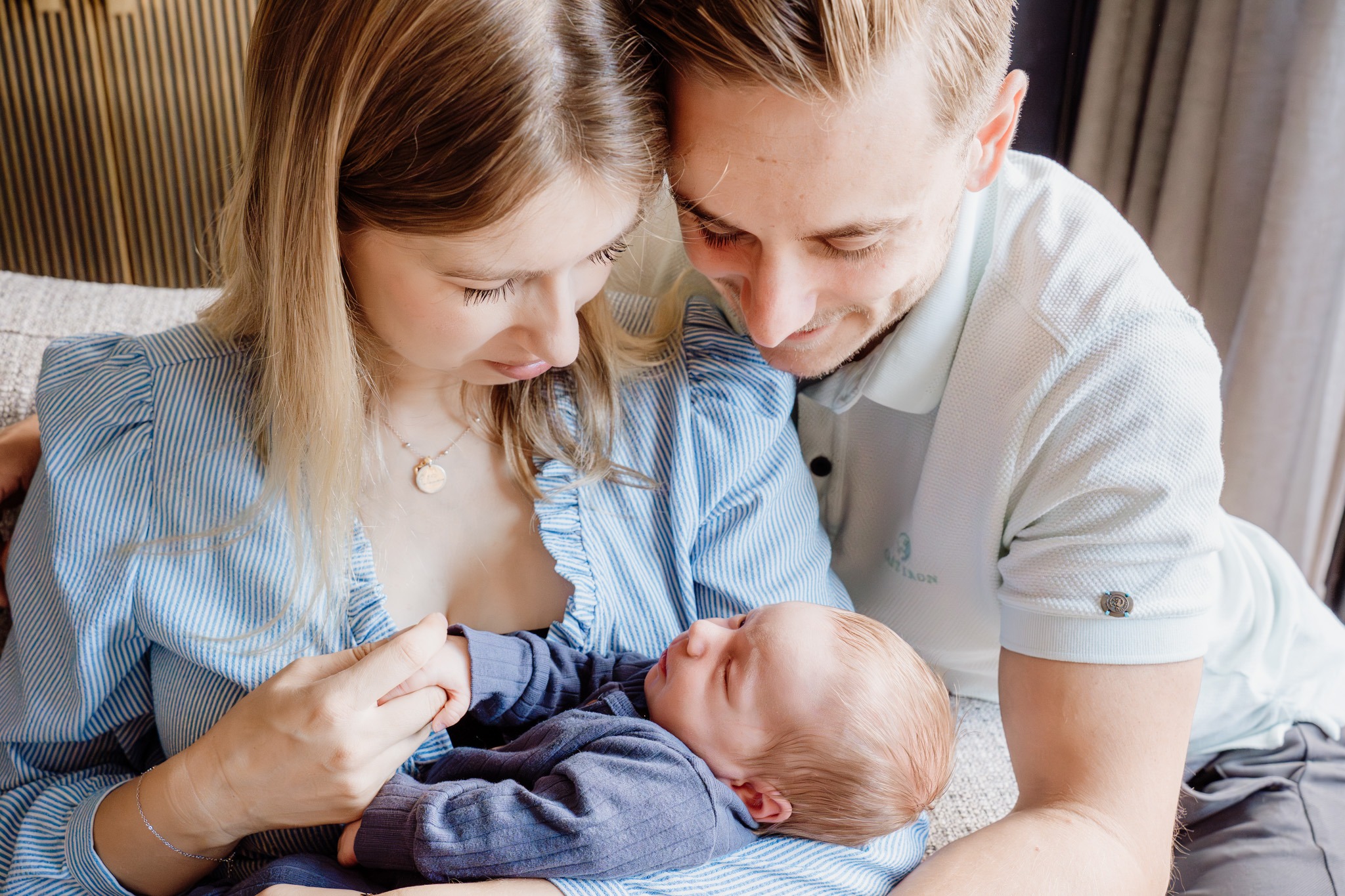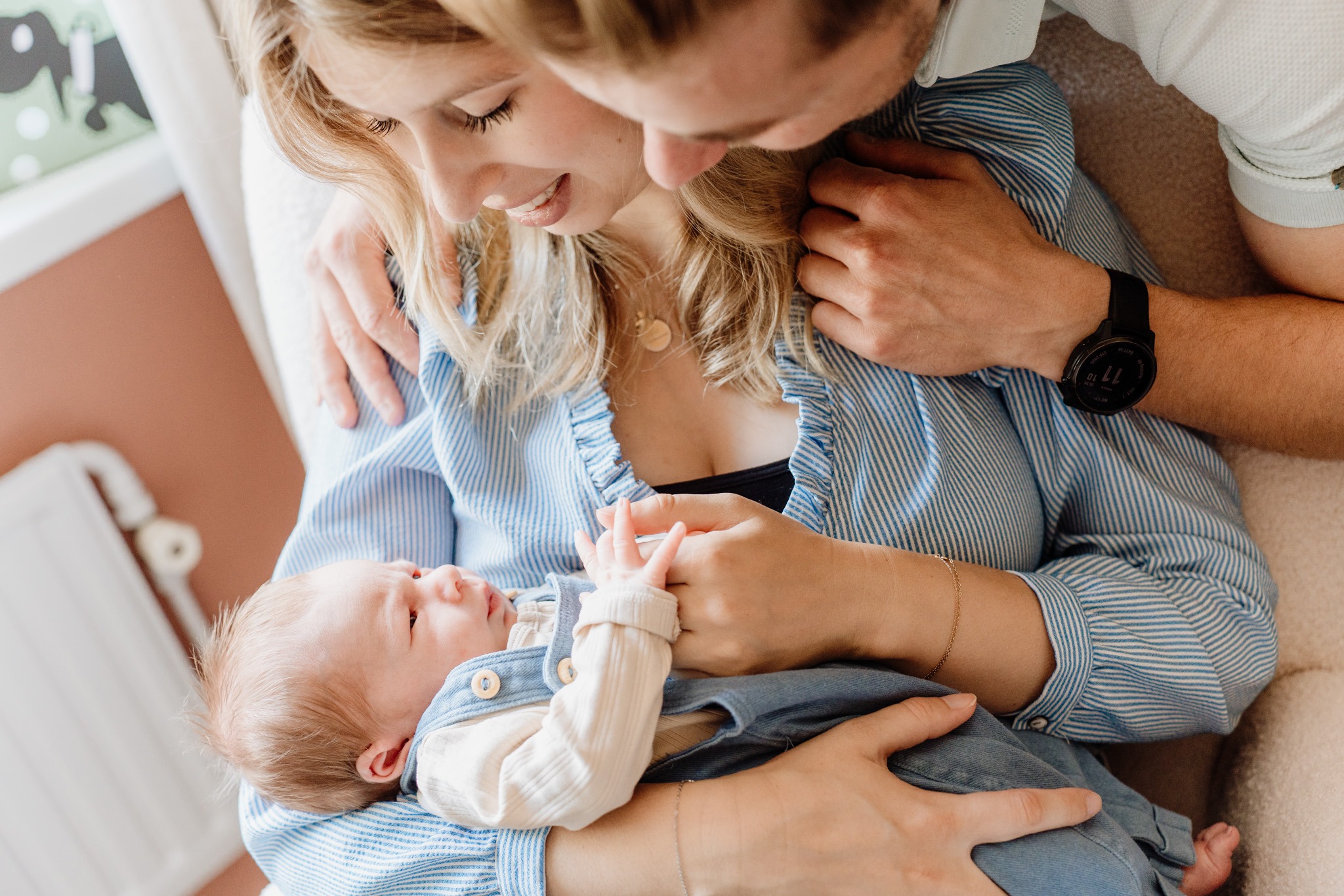 Tijdens de shoot focus ik niet alleen op het hele gezin, maar juist ook op die kleine dingetjes die je later bijna zou vergeten. De piepkleine handjes van Jip, hoe hij tevreden tegen mama aan ligt te slapen of die eerste haartjes. Het gaat allemaal zo bizar snel voorbij. Juist die details maken de herinnering compleet. We zijn ook nog even naar de babykamer gegaan voor wat foto’s in de schommelstoel, een heerlijk licht plekje waar Jip zich duidelijk heel fijn voelde.