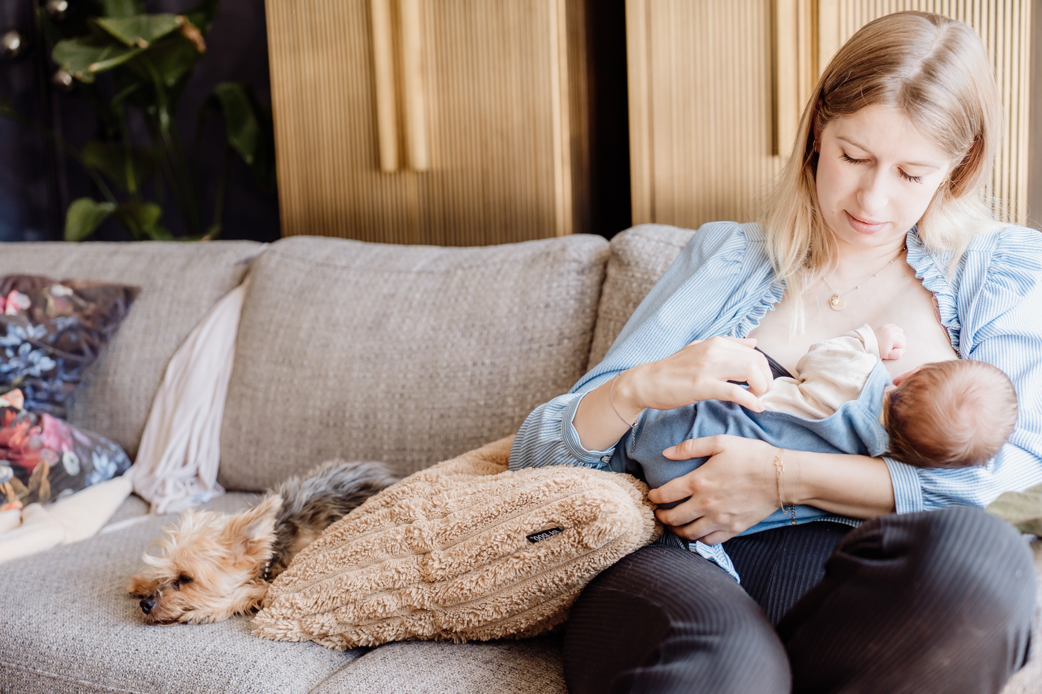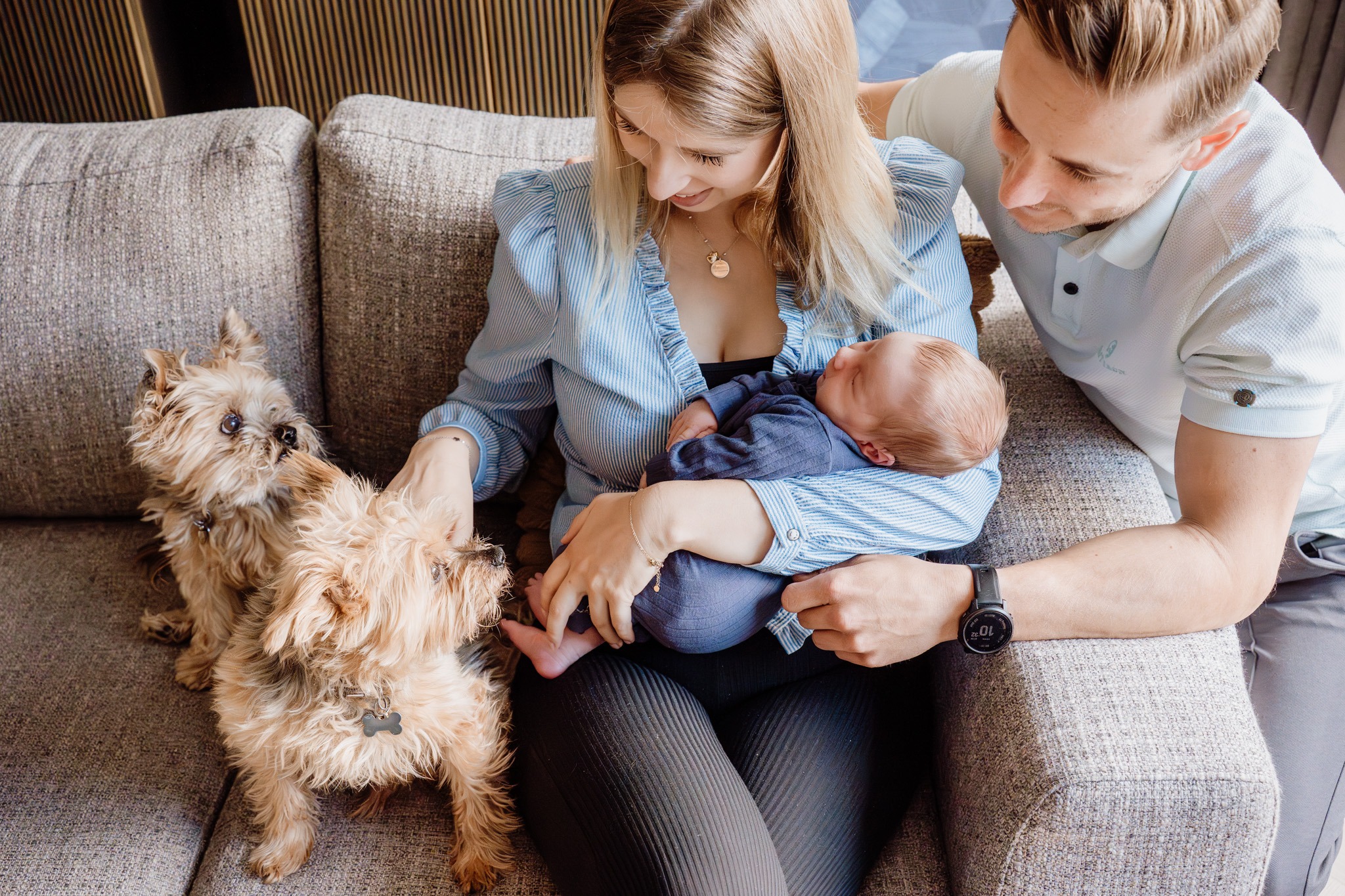 Het voelde meteen weer vertrouwd om ze te zien. Dat is ook het voordeel als ik de zwangerschapsshoot al heb gedaan; je kent elkaar al een beetje. Tijdens zo’n ochtend neem ik echt de tijd. Terwijl Jip heerlijk lag te slapen en de honden nieuwsgierig op de bank kwamen kijken, legden we die eerste, kostbare momenten vast. Geen geposeer, maar gewoon zoals jullie zijn als gezin.