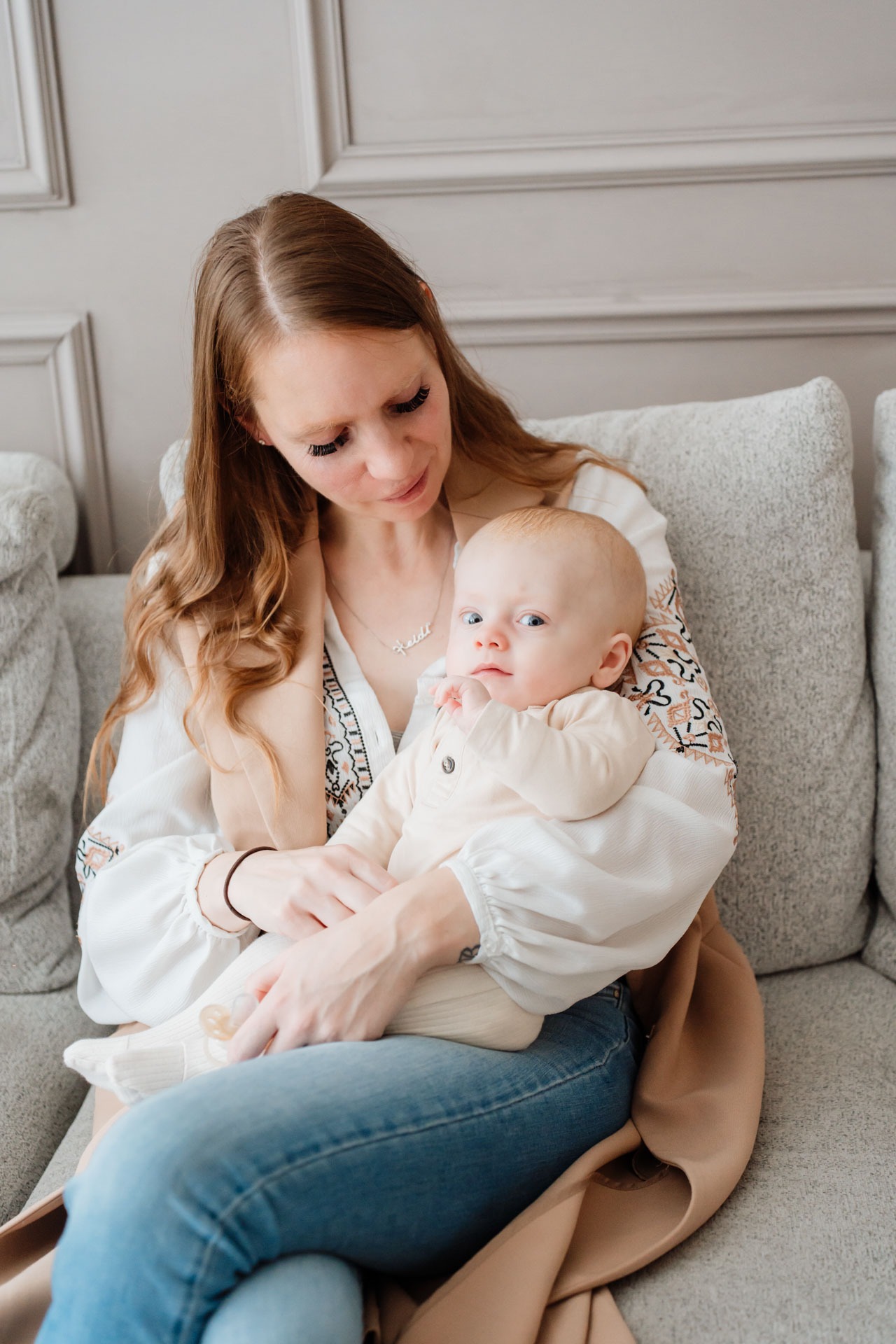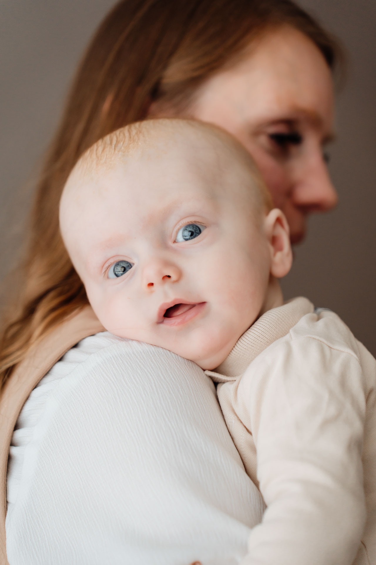 Omdat hij al wat ouder was, was er echt al interactie. Hij keek me met die grote ogen aan en was de wereld om zich heen al volop aan het ontdekken. Dat speelse en die eerste bewuste blikken… ik vond het ge-wel-dig. Het geeft de foto’s net even een andere energie dan bij een baby van twee weken oud.