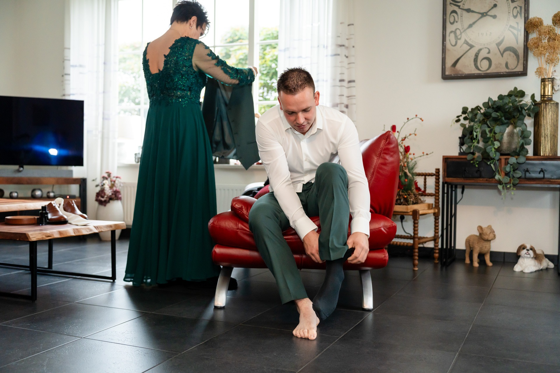 Omdat de planning op de schop ging, ontstond er een unieke kans om de dag op een bijzondere manier in te vullen. Ik begon ’s ochtends bij André thuis om het klaarmaken vast te leggen. Die momenten van de ‘getting ready’ zijn voor mij als fotograaf goud waard. De gezonde zenuwen die door de lucht trillen, het zorgvuldig strikken van de das en de laatste blik in de spiegel voordat het echt gaat beginnen.