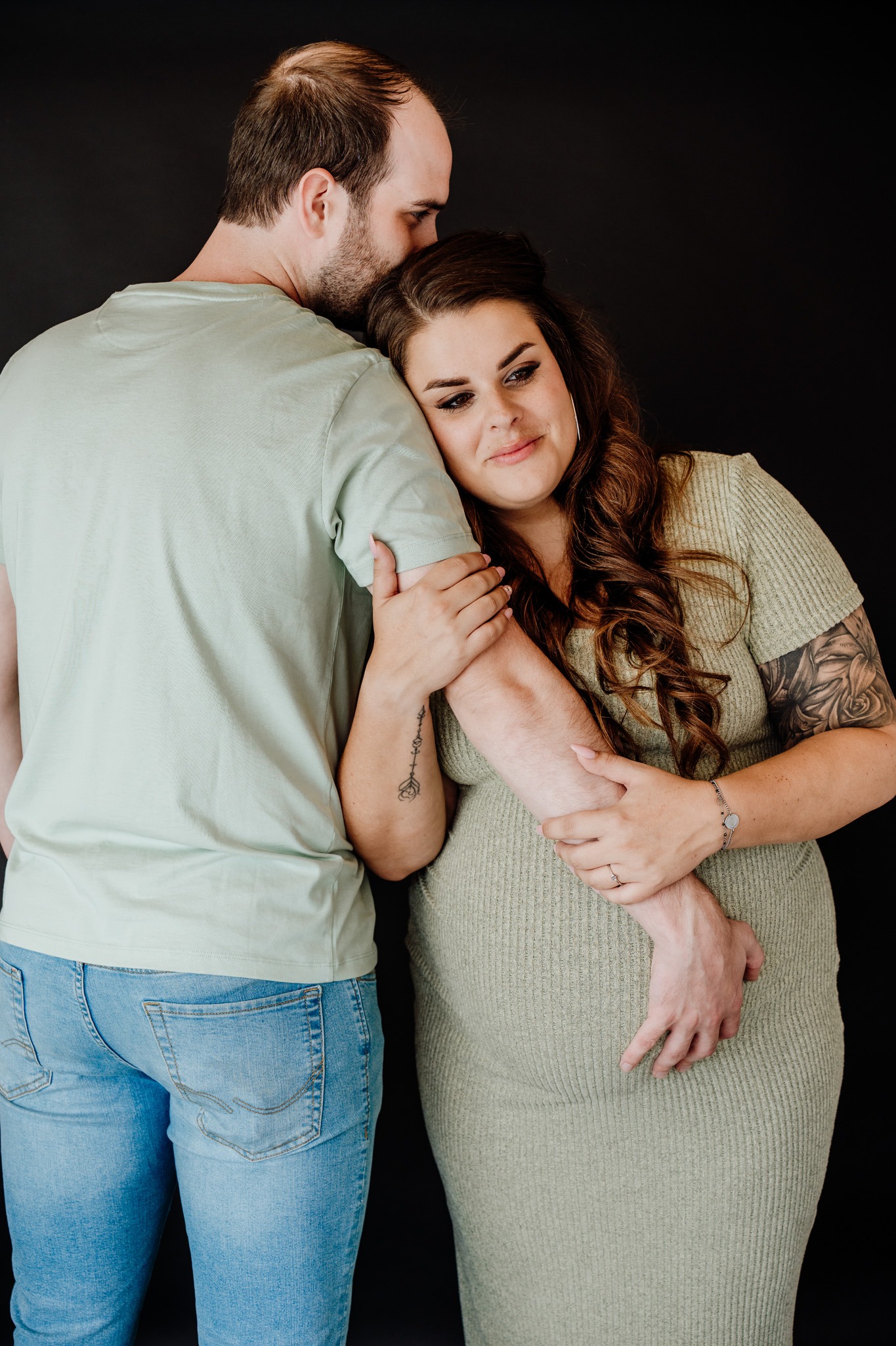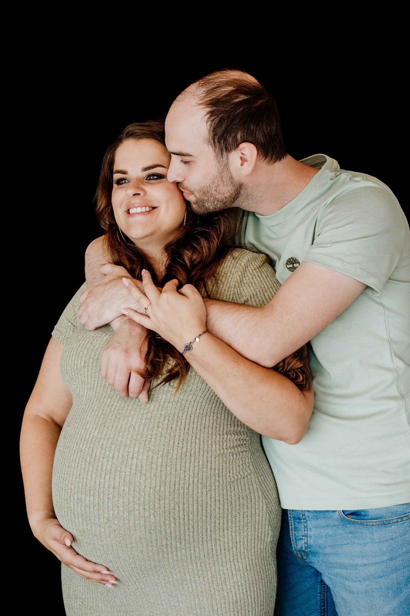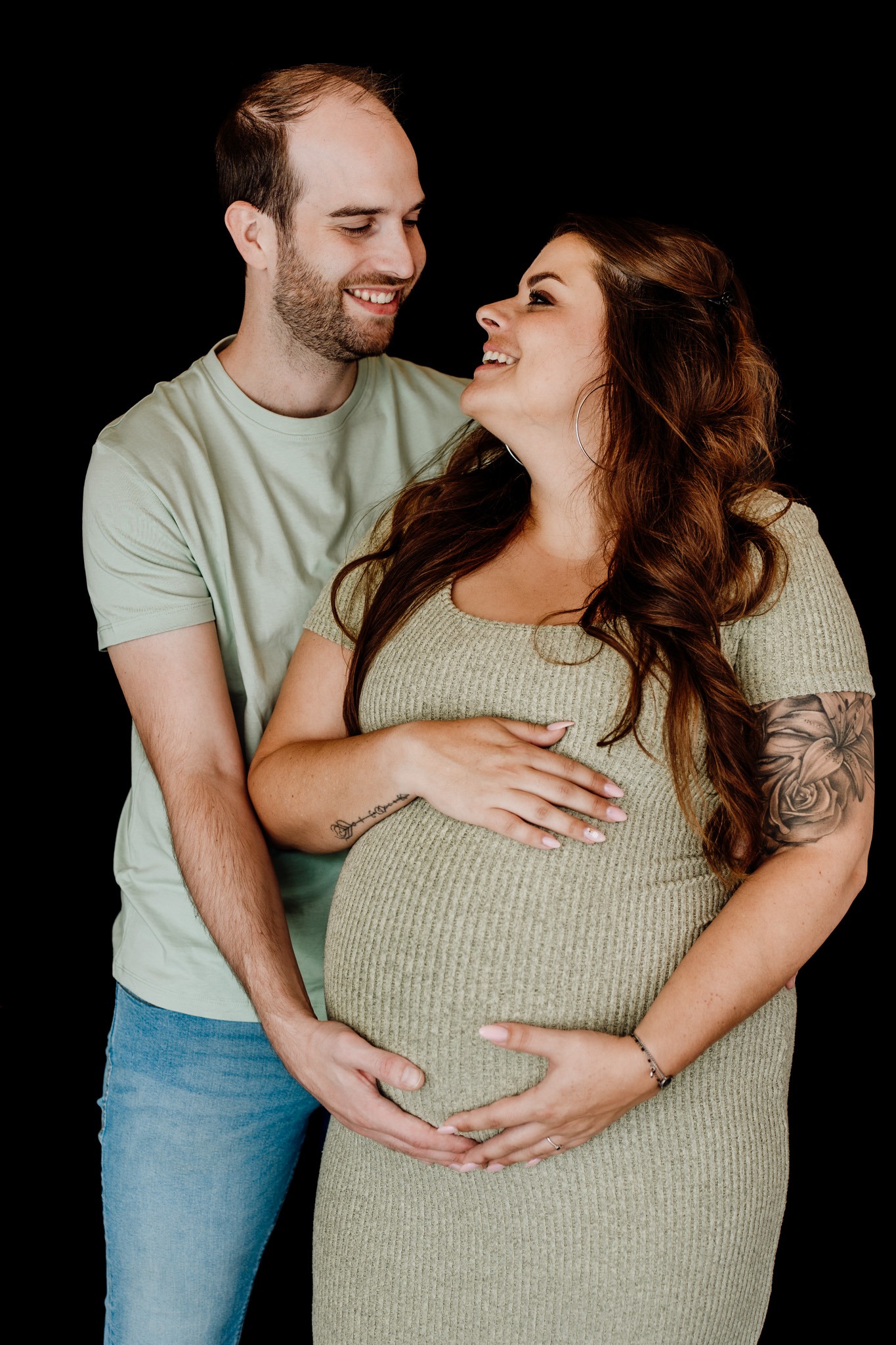We kozen deze keer voor een zwangerschapsshoot met zwarte achtergrond. Dat wordt echt niet vaak gedaan, maar het resultaat is bizar mooi. Vaak denken mensen bij studiofoto’s aan een witte of lichte wand, maar juist dat donkere geeft een heel ander gevoel. Die groene jurk steekt er zo gaaf bij af tegen het donker! Het zorgt ervoor dat alle aandacht direct naar de buik en de blikken van het gezin gaat. Je krijgt een soort focus die je in een lichte kamer minder snel hebt.