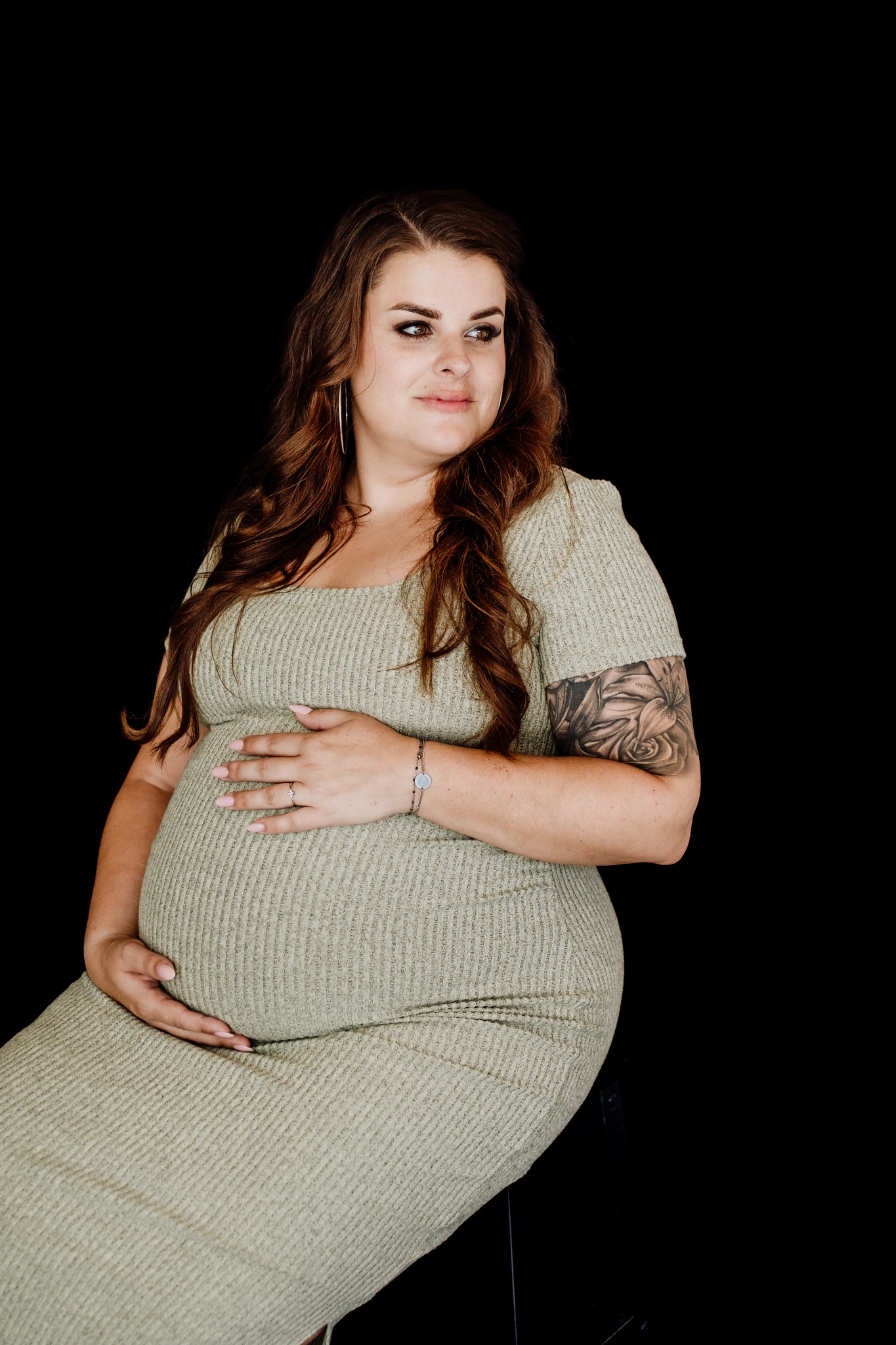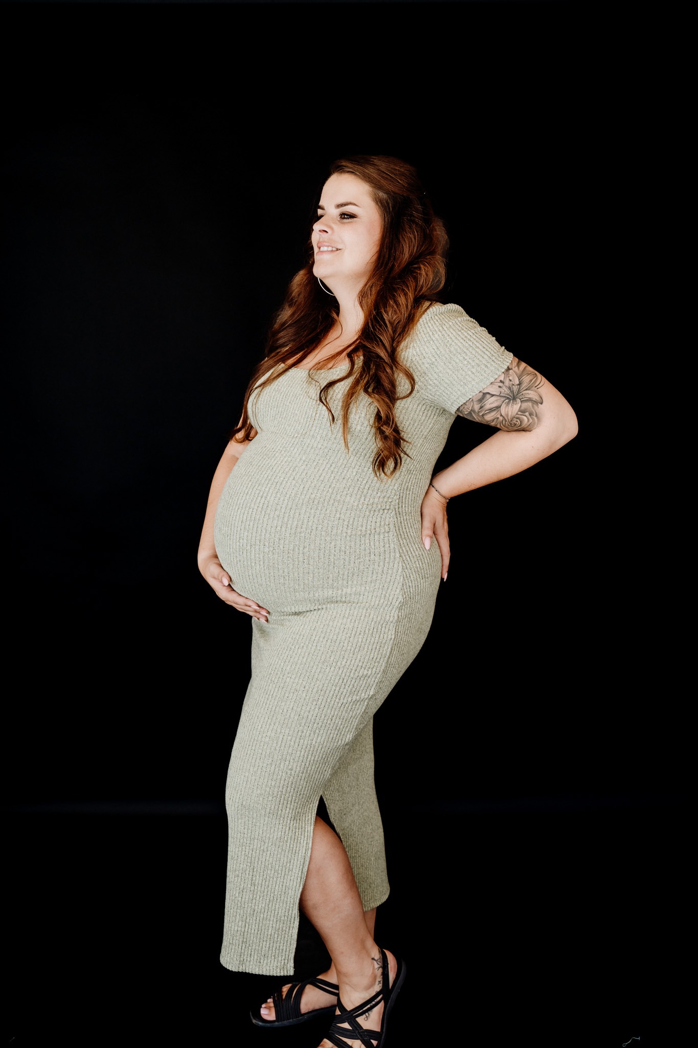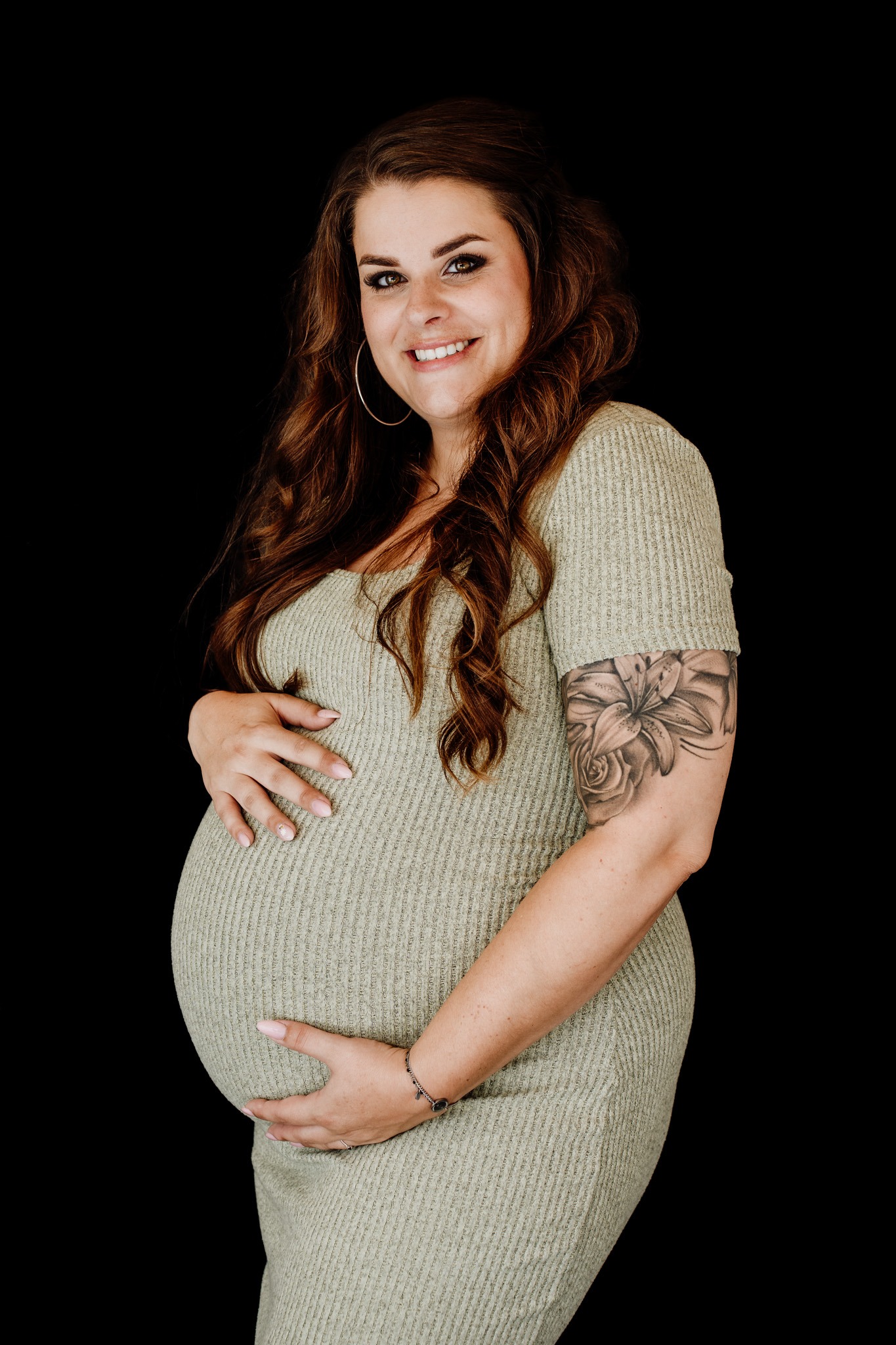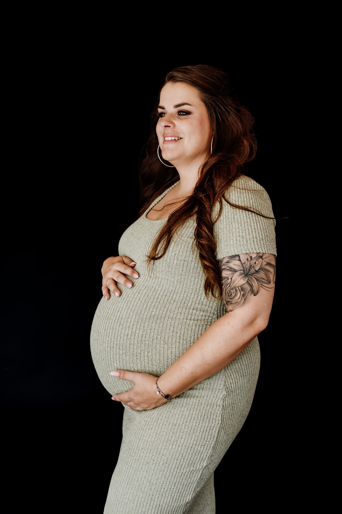 We kozen deze keer voor zwangerschapsshoot met zwarte achtergrond. Dat wordt echt niet vaak gedaan, maar het resultaat is bizar mooi. Die groene jurk steekt er zo gaaf bij af tegen het donker! Het geeft de foto’s een hele bijzondere sfeer die je niet overal ziet.