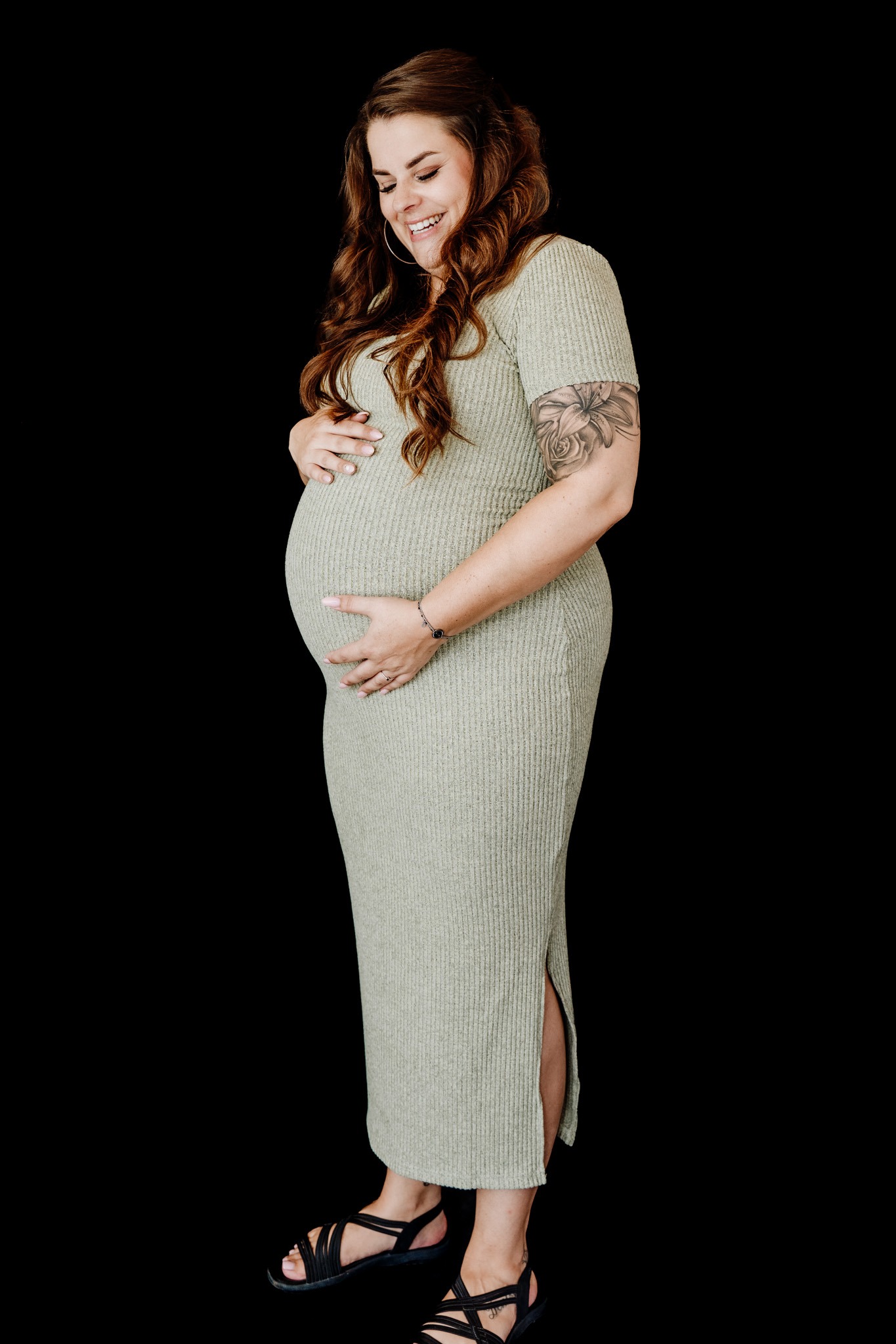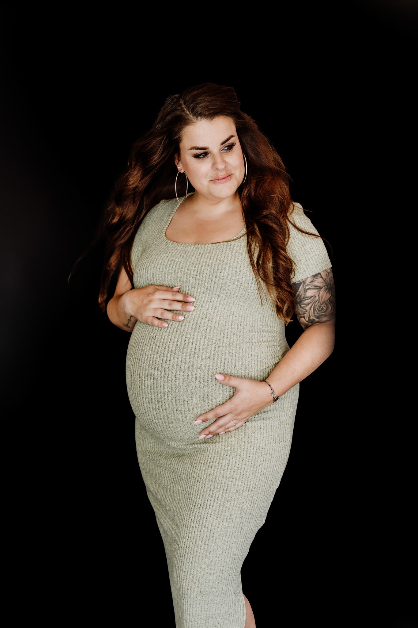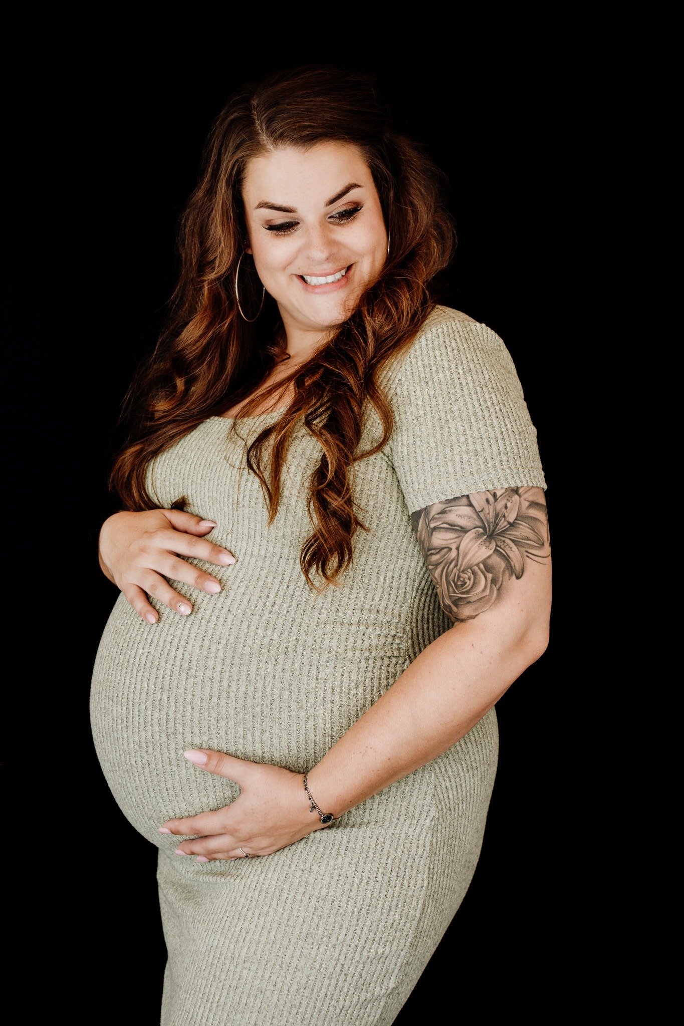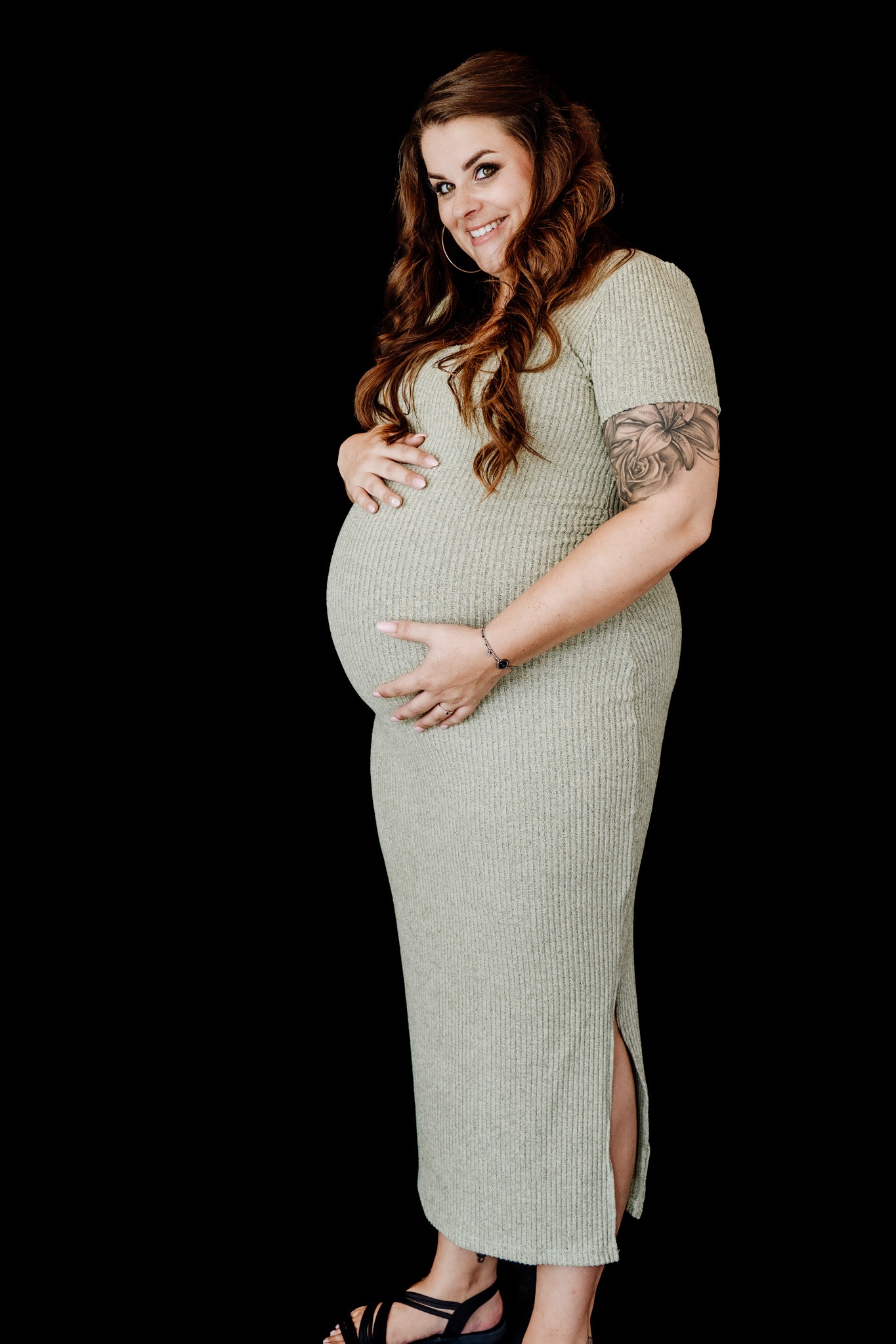 We kozen deze keer voor zwangerschapsshoot met zwarte achtergrond. Dat wordt echt niet vaak gedaan, maar het resultaat is bizar mooi. Die groene jurk steekt er zo gaaf bij af tegen het donker! Het geeft de foto’s een hele bijzondere sfeer die je niet overal ziet.